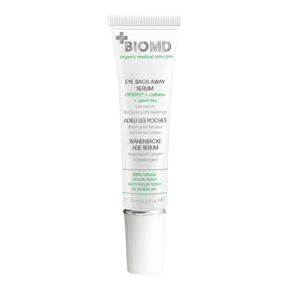 BioMD Eye Bags Away Eye Serum silmaaluste tursete vastu aitab vähendada silma all olevaid turseid ning pärssida veresoonte läbilaskvust. Lisaks aitab seerum vähendada miimikakortse ja silub ning niisutab silmaümbrust.