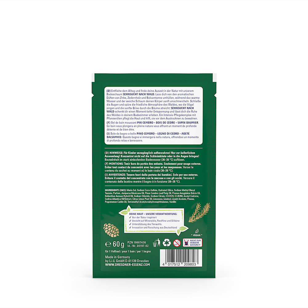 Igatsus metsa järele. Hinga sisse, lase lahti ja loo ühendus loodusega. Astu metsa rahulikku embusse koos meie vahutava vannisoolaga. Šveitsi männi, seedripuu ja palsamikuuse kosutav aroom viib teid lopsakasse metsa, kus karge õhk ja kõrguvate puude lõhn rahustavad meeli. Kui soe vesi ja õrn vaht sind ümbritseb, tunned, et igapäevane stress kaob ja oled sügavalt lõdvestunud.
