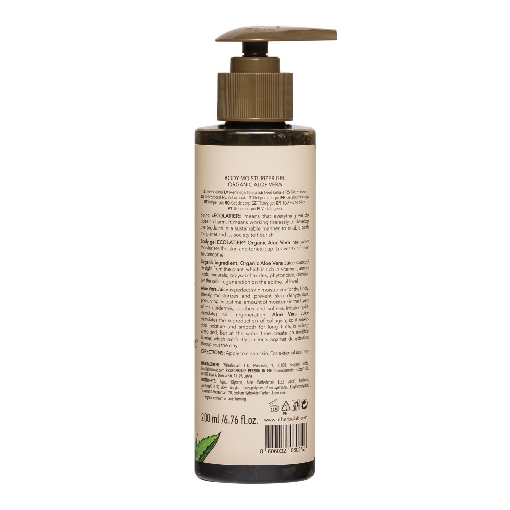 Niisutav kehageel ECOLATIER® Organic Aloe Vera niisutab intensiivselt ja toniseerib nahka. Jätab naha elastsemaks ja siledamaks. Ohutu kõigile nahatüüpidele, Worry-free koostis, sobib ka veganitele. Taimset päritolu orgaaniline aaloe vera, mis on rikas vitamiinide, aminohapete, mineraalide, polüsahhariidide ja fütonsiidide poolest, stimuleerib rakkude taastumist epiteeli tasemel. Aloe vera on ideaalne nahaniisutaja, niisutab sügavalt ja ennetab naha dehüdratsiooni, säilitades optimaalse niiskuse koguse epidermise kihtides, rahustab ja pehmendab ärritunud nahka, stimuleerib rakkude uuenemist. Aloe vera stimuleerib kollageeni taastootmist, seega muudab naha pikaks ajaks niisutatuks ja siledaks, imendub kiiresti, toetab naha loomulikku kaitsebarjääri, mis kaitseb suurepäraselt dehüdratsiooni eest kogu päeva vältel.