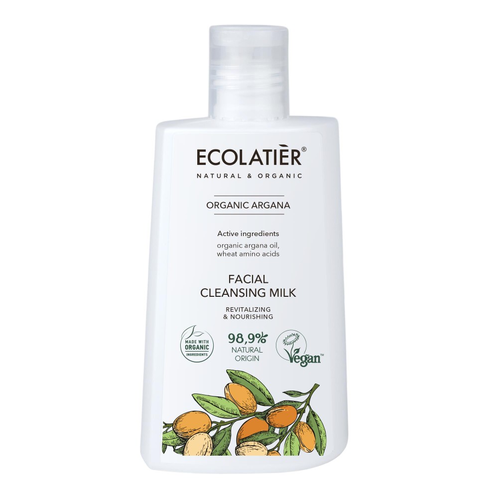 ECOLATIER® Organic Argana Oil nahka elustav ja toitev näopuhastuspiim põhineb looduslikel ja mahepõllumajanduslikel koostisosadel. Puhastab nahka õrnalt ja eemaldab meigi. Õrn koostis muudab naha toidetuks ja pehmeks. Mahe argaaniaõli on rikas A- ja E-vitamiinide, samuti antioksüdantide, oomega-6-rasvhapete ja linoolhappe poolest. Argaaniaõliga kosmeetikavahendite kasutamine soodustab naha tervislikkust, parandab elastsust, vähendab kortse ning hoiab naha niisutatuna. Aminohapped – toetavad rakkude parandamist, niisutavad nahka ja pakuvad antioksüdantset kaitset.